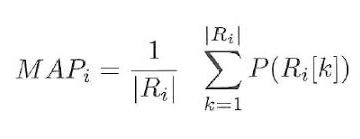 假设我们已经给出了三个推荐,[0,1,1]。这里0表示推荐是不正确的,而1表示推荐是正确的。那么k的精度是[0 ,1/2, 2/3],平均精度是(1/3)*(0+1/2+2/3)=0.38。