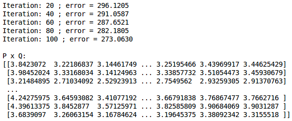 mf = MF ( R , K = 20 , alpha = 0.001 , beta = 0.01 , iterations = 100 )