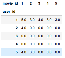 我们必须将用户-电影评分转换为矩阵形式,在python中使用pivot函数来完成转换。