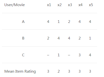 我们可以看到一个用户-电影评分矩阵,为了更深入地理解这个公式,让我们在上表中找到用户(A, C)和(B, C)之间的相似性。A与C共同评分的电影是x2和x4,B与C共同评分的电影是x2,x4和x5。