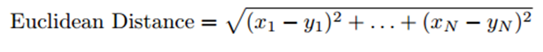 欧几里得距离:如果在N维空间中绘制,相似的实体将会彼此靠近。因此,我们可以计算实体之间的距离根据这个距离,向用户推荐内容。下面是欧几里得距离公式: