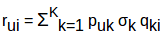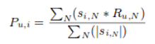 就我们之前的电影例子而言,这个算法根据他们之前给不同电影的评分来发现每个用户之间的相似性。用户u的一个实体的预测是通过计算其它用户对一个实体i的用户评分的加权总和来计算的。Pu,i通过下式计算得到: