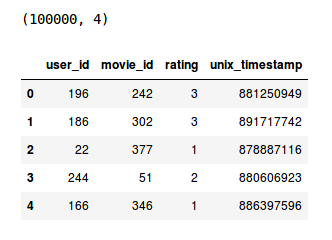 r_cols = [ 'user_id' , 'movie_id' , 'rating' , 'unix_timestamp' ]