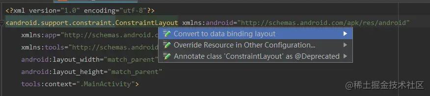 打开布局文件,选中根布局的 ViewGroup,按住 Alt + 回车键,点击 “Convert to data binding layout”,就可以生成 DataBinding 需要的布局规则