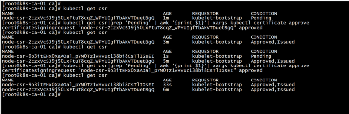 kubectl get csr|grep 'Pending' | awk '{print $1}'| xargs kubectl certificate approve