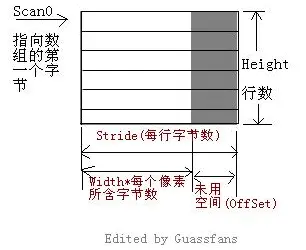 Height属性:被锁定位图的高度Width属性:被锁定位图的高度PixelFormat属性:数据的实际像素格式Scan0属性:被锁定数组的首字节地址,如果整个图像被锁定,则是图像的第一个字节地址Stride属性:步幅,也称为扫描宽度