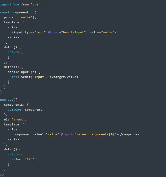 假设有一个输入框组件,用户输入时,同步父组件页面中的数据。 具体思路:父组件通过props传值给子组件,子组件通过 $emit 来通知父组件修改相应的props值,具体实现如下: