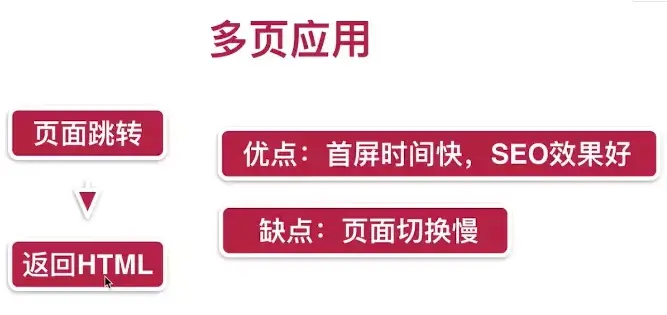 搜索引擎在做网页排名的时候,要根据网页内容才能给网页权重,来进行网页的排名。搜索引擎是可以识别html内容的,而我们每个页面所有的内容都放在Html中,所以这种多页应用,seo排名效果好。 但是它也有缺点,就是切换慢 因为每次跳转都需要发出一个http请求,如果网络比较慢,在页面之间来回跳转时,就会发现明显的卡顿。