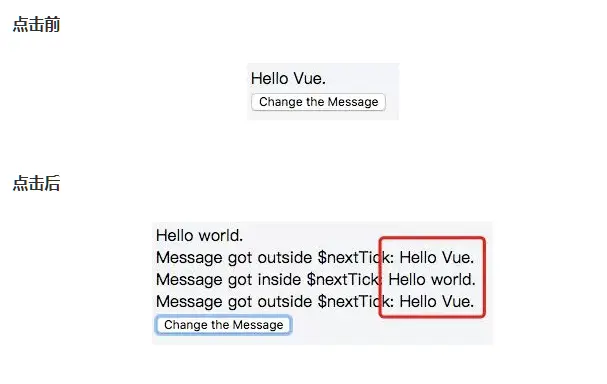 从图中可以得知:msg1和msg3显示的内容还是变换之前的,而msg2显示的内容是变换之后的。其根本原因是因为Vue中DOM更新是异步的(详细解释在后面)。