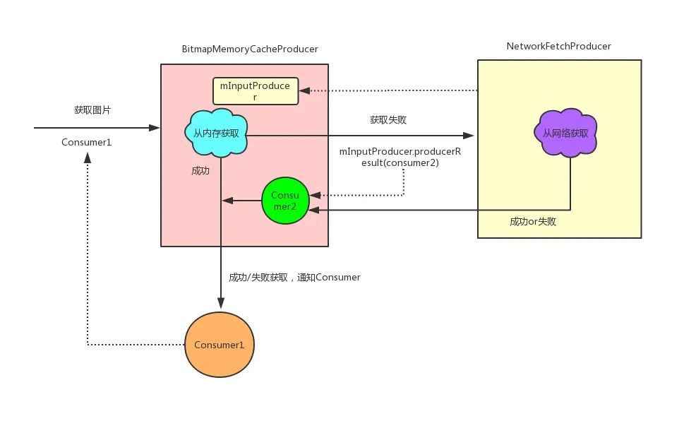 一个ProducerA可以接收另一个ProducerB作为参数,如果ProducerA处理完毕后可以调用ProducerB来继续处理。并传入Consumer来观察ProducerB的处理结果。比如Fresco在加载图片时会先去内存缓存获取,如果内存缓存中没有那么就网络加载。这里涉及到两个Producer分别是BitmapMemoryCacheProducer和NetworkFetchProducer,假设BitmapMemoryCacheProducer为ProducerA,NetworkFetchProducer为ProducerB。我们用伪代码看一下他们的逻辑: