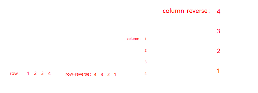 首先row就是默认的左对齐,紧接着的row-reverse就是反向了,也就是右对齐。然后column就是纵对齐了,最后一个属性也是反向了。如果还不明白就看下面几张图