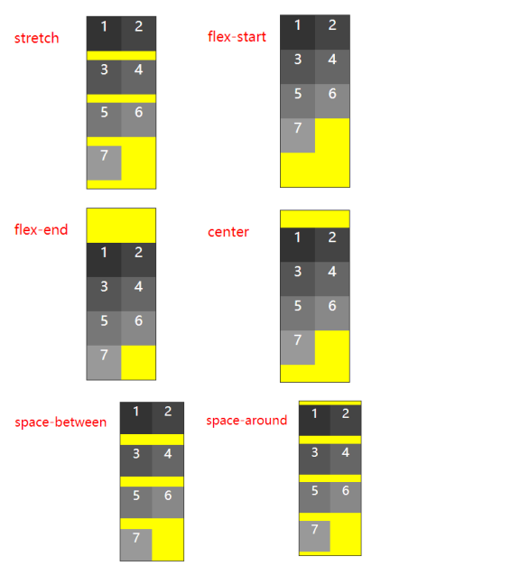 那么知道容器存在X轴Y轴以后,再回到这个属性上来理解就容易多了,首先可以是X轴的排列方向,也就是通俗的左对齐和右对齐,然后是Y轴的纵对齐,看下面列出来的值就简单明了了