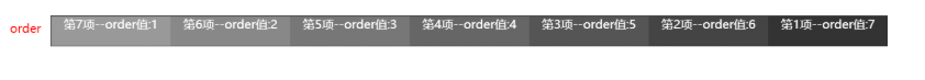 1、order ,设置order属性也跟排序有关,order翻译过来就是“顺序”,那么在子项中,设置了order后改变它的值即可改变子项在排列中的顺序,值越小那么越靠前,相反,值越大越靠后,看下面demo图