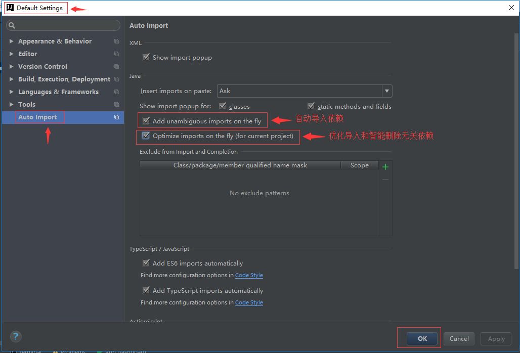 具体步骤:顶部工具栏 File ->Other Settings -> Default Settings -> Auto Import