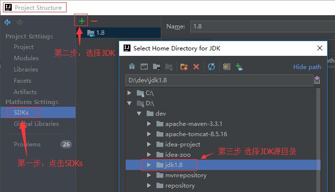 示例: 根据下图步骤设置JDK目录,最后点击OK保存。