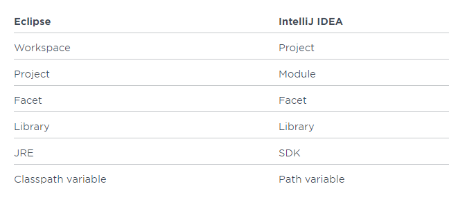 由下图可见:两者最大的转变就在于工作空间概念的转变,并且在IDEA当中,Project和Module是作为两个不同的概念,对项目结构是重要意义的,这也恰恰是许多IDEA初学者觉得困扰的地方。