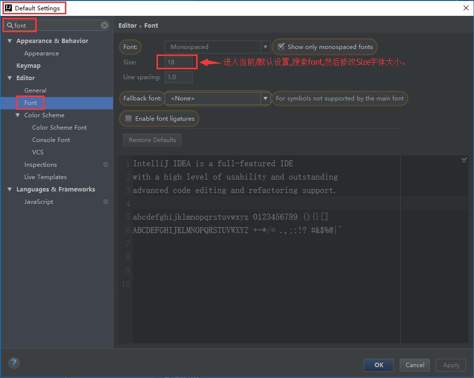 默认的白色背景和细小的字体会影响大家的编码体验,这里特意提供了调整代码窗的快捷配置。打开配置,搜索Font,然后再Font可以调整字体类型,Size可以调整字体大小,如图: