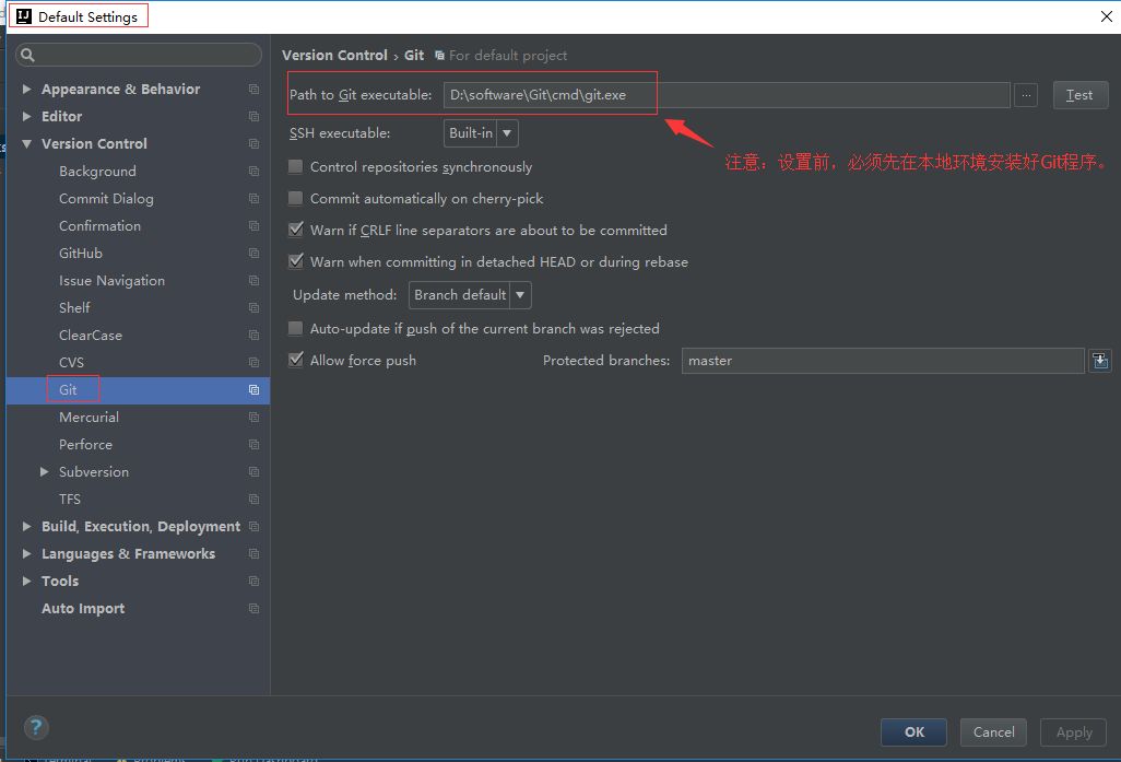 示例: IDEA默认集成了对Git/Svn的支持 直接设置执行程序,右边Test提示成功即可。