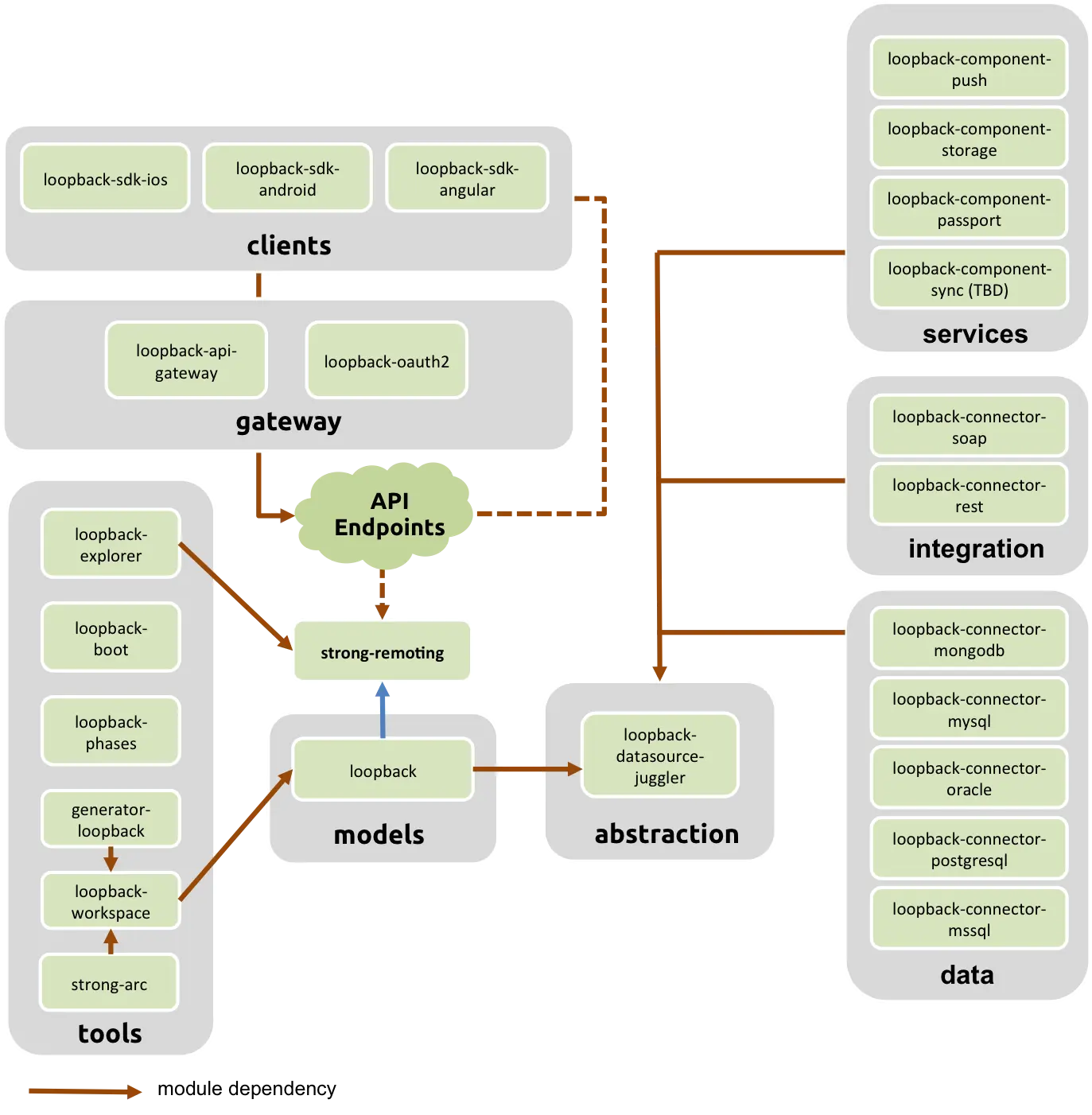 以下是官网提供的图表展示了核心LoopBack模块,以及他们之间的关系
