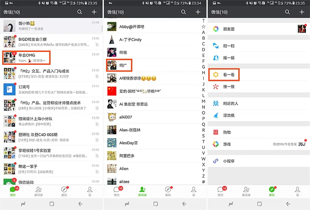 例如微信几个关键界面的字体:下图我用红色框框起来的条目部分的文字,三个主界面不尽相同,但是,字体大小、颜色、布局的样式都一样,这样让整个APP视觉上看起来很舒服,这就是字体一致性。因此,我们在做视觉设计的时候尽量使用同一风格的文字。