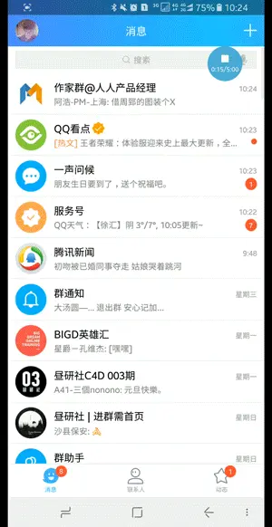 比如安卓版手机QQ信息列表的打开方式:它的信息都是列表式结构,不管你点击哪一行条目,下一级界面都是由右往左滑出,点击顶部左上角的返回按钮会从左往右滑回,体验相当一致。这就是反馈一致性的体现,如下动图: