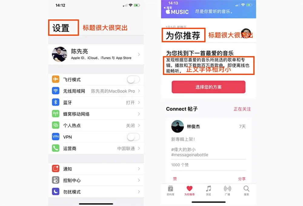 苹果手机中自带的软件(iOS11设计规范):在新版本的苹果手机自带的软件中标题都属于字体放大,界面简洁的设计风格。还有苹果自带的音乐软件中,段落中的标题和正文区别是很明显的,标题明显很大,而正文部分相对较小,这就是优美简约原则的体现,如下图: