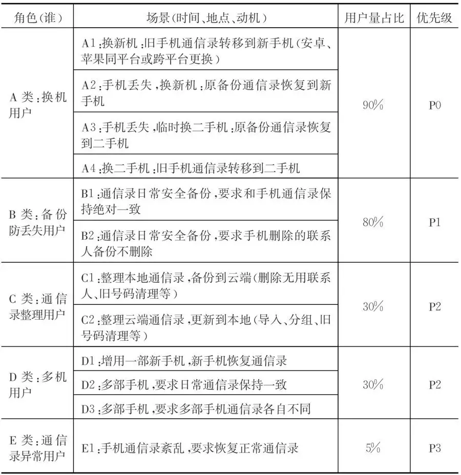 80/20法则有助于整合资源,可以提升设计的最大化。上面假设的场景就是一个真实的案例。《腾讯产品法》中例举出QQ同步助手需求场景分析案例(如上图所示),对于工具类的产品来说,产品要解决的「问题」很清楚,用户在人口学、社会学方面的因素,如性别、年龄等对产品影响不大,所以可以选择按「使用场景」来划分用户模型。QQ同步助手中A类换机用户和B类备份防丢失用户的用户量占比分别是90%和80%,利用80%的时间集中该产品20%的主要功能时,那么我们的设计就要集中发力在这些关键功能上面,所以此两类功能也被定义为了产品核心动线。