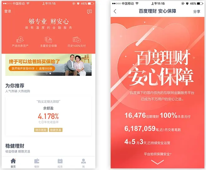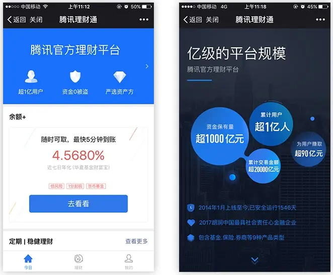 举个例子:来看金融理财平台产品,用户选择金融理财平台跟用户预期密切相关,只有在用户的心理有足够的安全感和信任感才会选择这个平台进行投资。腾讯理财通,首页用首屏1/3的位置来介绍腾讯理财通这个平台,并且强调了腾讯的背书。这些信息的目的就是打消用户的顾虑,从用户的心理预期中先开始信任这个平台。同理百度理财的首页布局也是类似。