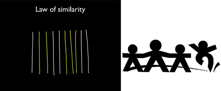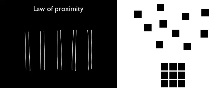 物体之间的相对距离会影响我们感知他是否以及如何组织在一起。互相靠近(相对于其他物体)的物体看起来属于一组。接近性原则权重要大于相似性原理