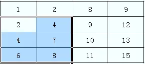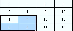我们先选取右上角的数字9,由于9大于7,而且9是第四列最小的数字,所以7不可能在第四列, 于是我们把第四列从数组中剔除(浅蓝部分表示数组中剩余部分)。
