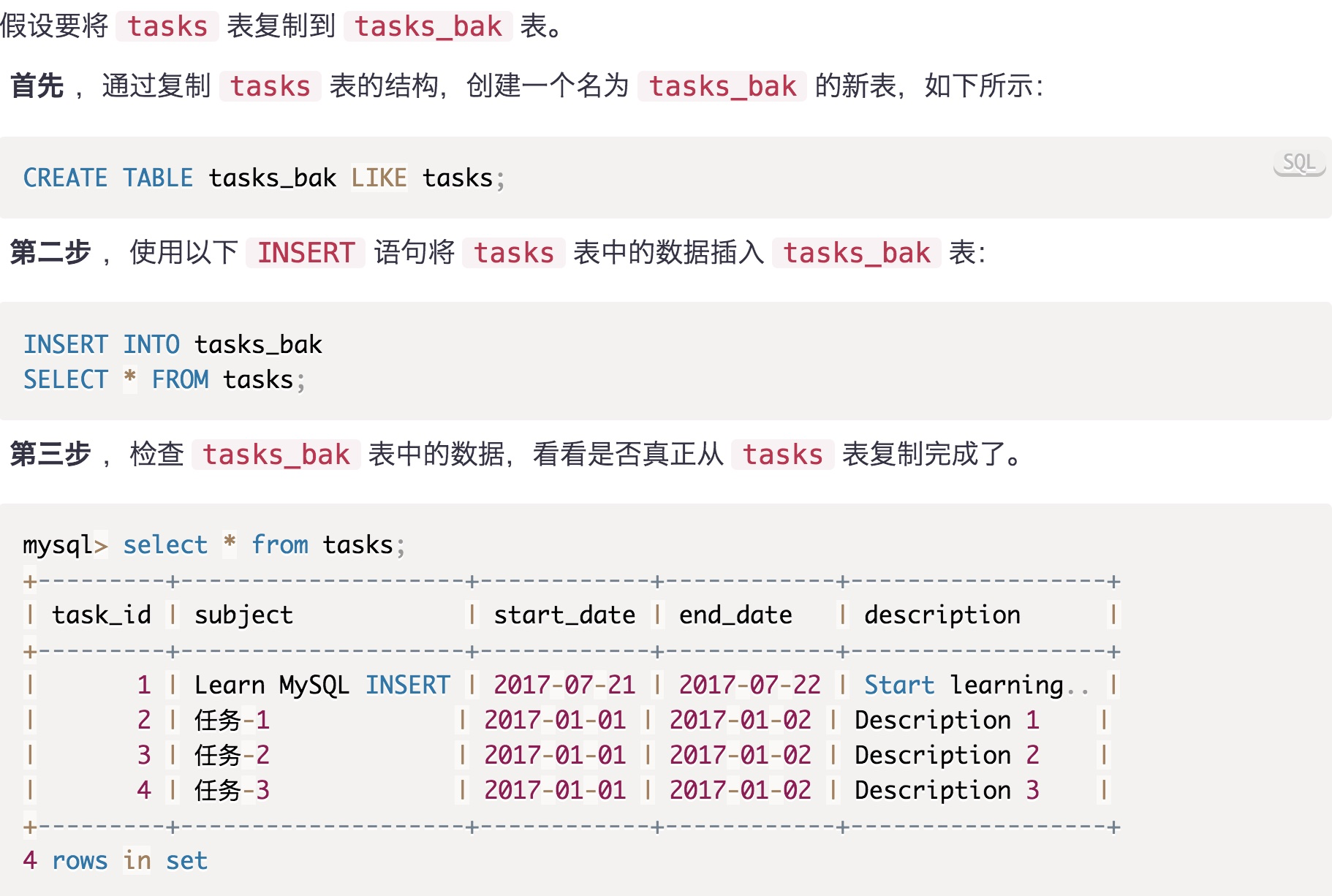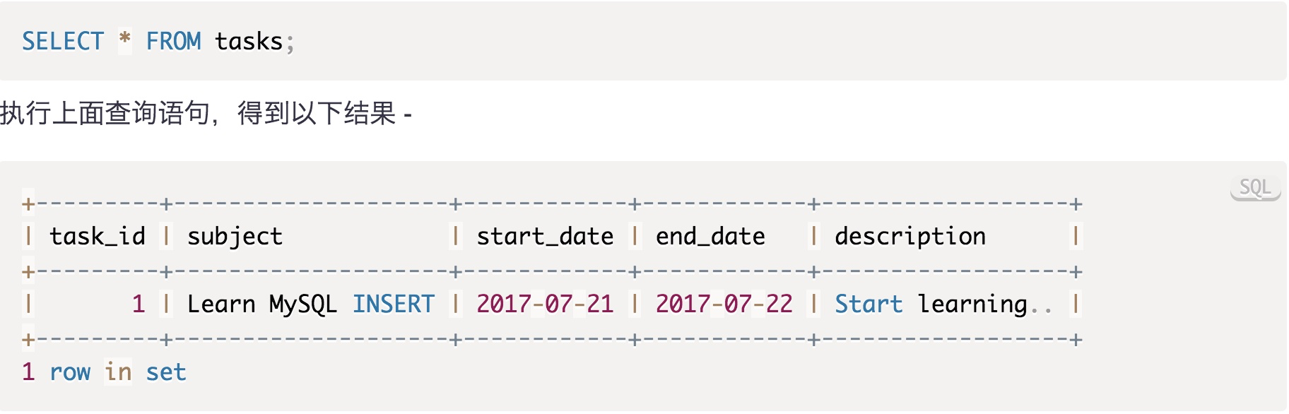 VALUES('Learn MySQL INSERT','2017-07-21','2017-07-22','Start learning..');