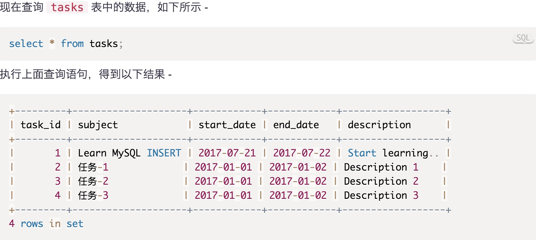 VALUES ('任务-1','2017-01-01','2017-01-02','Description 1'),