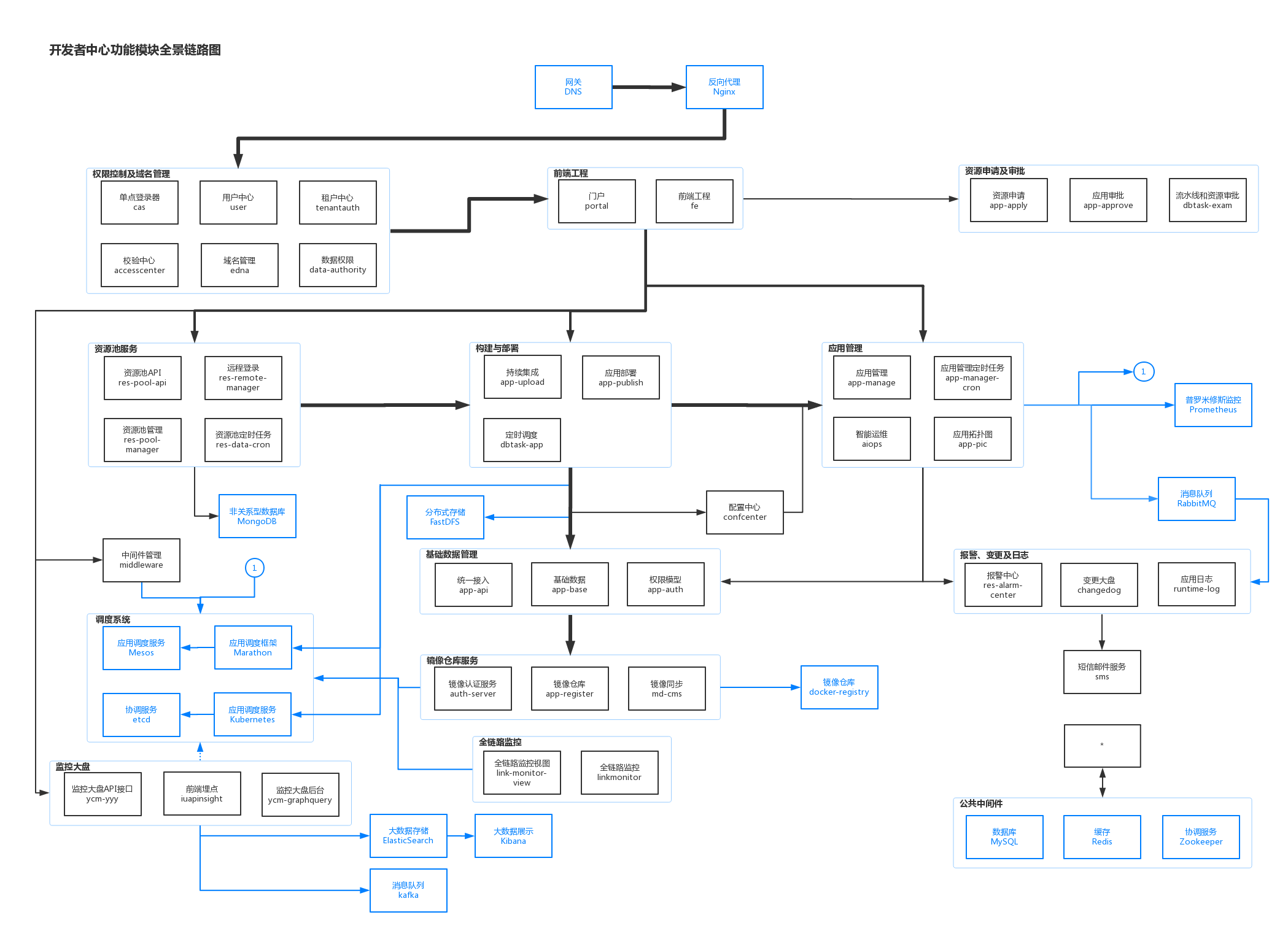开发者中心所涉及的模块众多,依赖中间件也较多,理清各模块间的调用关系,以及依赖的中间件关系,有助于在使用开发者中心遇到平台相关问题时,快速定位出现问题的模块,找出问题的原因所在,并解决问题。