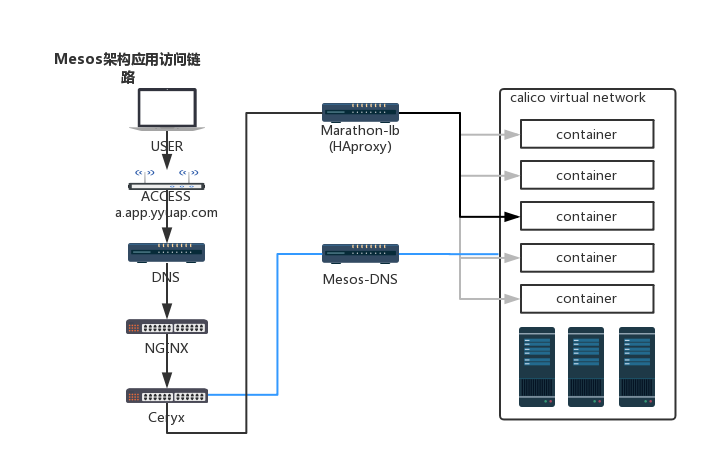 7. Ceryx通过Mesos-DNS域名解析服务,获取marathon-lb.isv.marathon.mesos 的实际IP地址,如192.168.33.101;