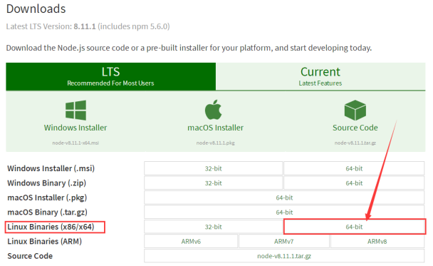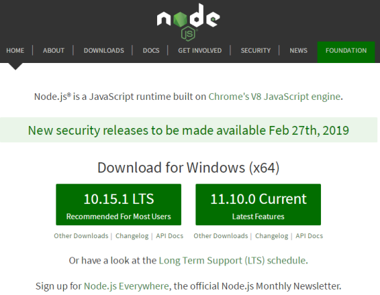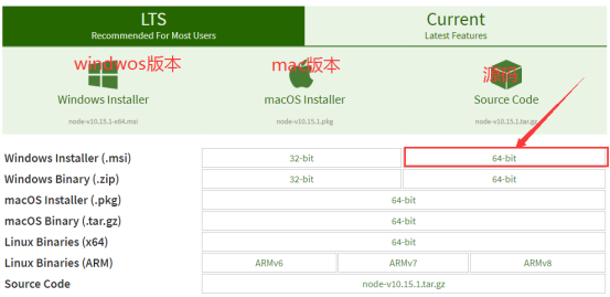 用户进入官网,会自动推荐适合于开发者电脑的Node.js版本,官网提示我下载适用于windows(x64)的版本。官网有两个版本LTS(长期稳定)版和Current(尝鲜)版。