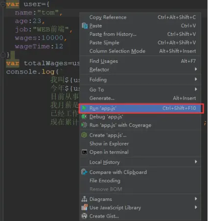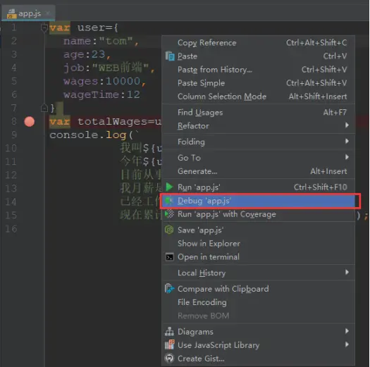 添加完断点就需要程序开始执行,值得注意的是,如果你是常规执行这段JS程序,点击鼠标右键使用run即可。但是如果你想要调试代码,必须单机鼠标右键使用Debuge。