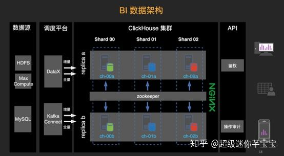 - ClickHouse集群:ClickHouse集群是这个架构的核心,ClickHouse提供分片与副本的模式供用户来进行部署,副本可以大大提高系统的并发性能,使系统的运行更加安全可靠。