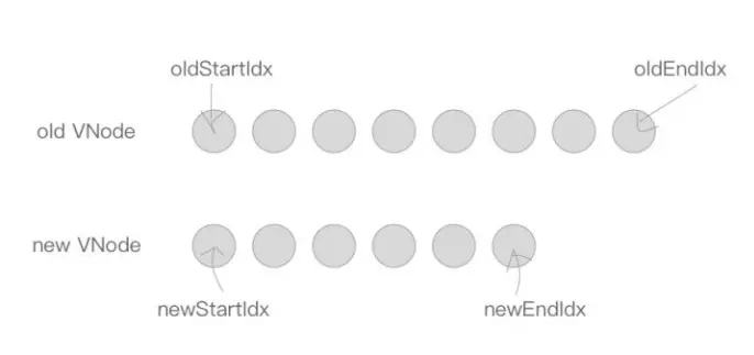 首先,在新老两个VNode节点的左右头尾两侧都有一个变量标记,在遍历过程中这几个变量都会向中间靠拢。