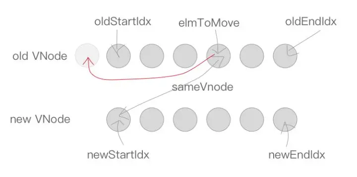 如果以上情况均不符合,则通过createKeyToOldIdx会得到一个oldKeyToIdx,里面存放了一个key为旧的VNode,value为对应index序列的哈希表。从这个哈希表中可以找到是否有与newStartVnode一致key的旧的VNode节点,如果同时满足sameVnode,patchVnode的同时会将这个真实DOM(elmToMove)移动到oldStartVnode对应的真实DOM的前面。