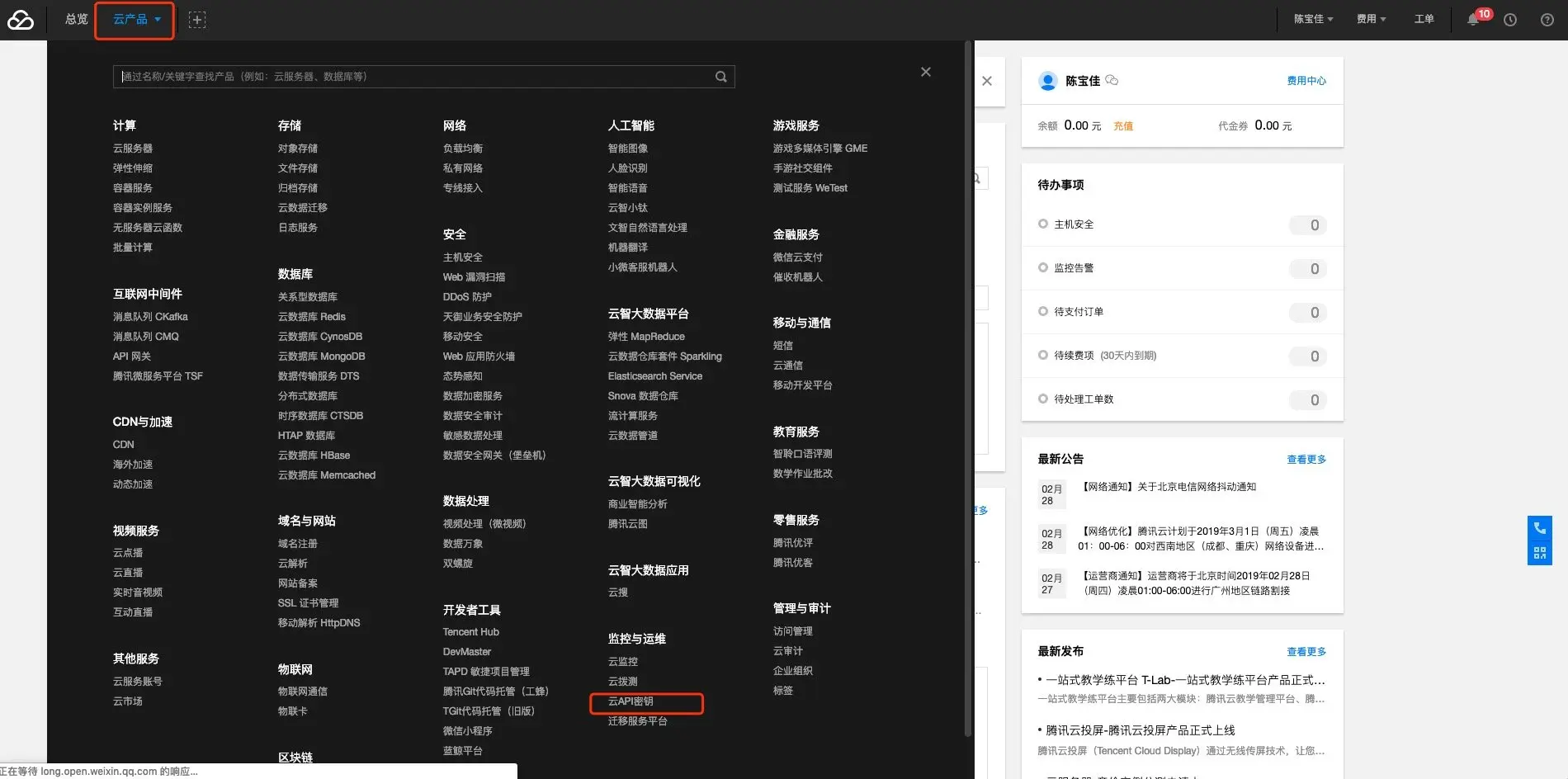 登录您的腾讯云控制台,点击左上角“云产品”,在弹出的界面中点击“云API密钥”,或者您也可以直接登录访问https://console.qcloud.com/capi;