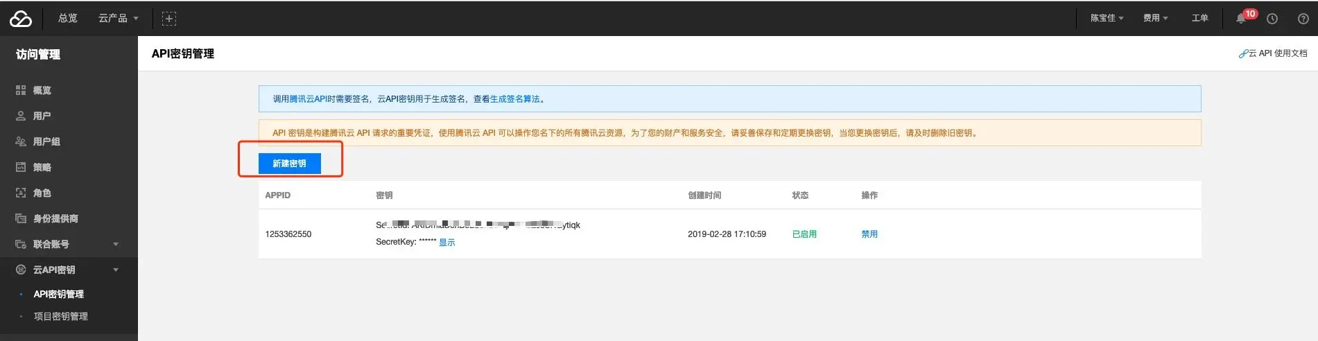 进入“云API密钥”管理界面,您将看到您的API密钥列表,API密钥由APPID、SecretId及SecretKey组成,如果该列表为空,请点击“新建密钥”创建一个;
