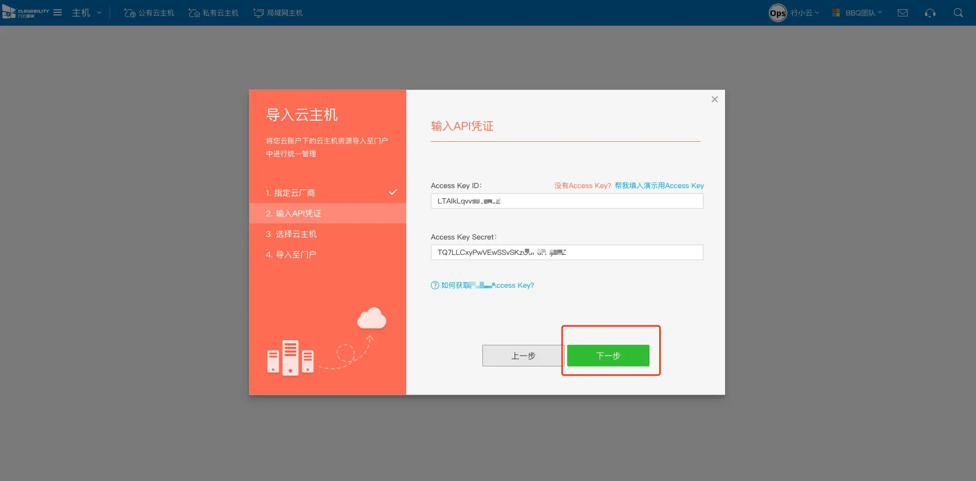 输入你的Access Key ID和Access Key Secret,选择“下一步”;