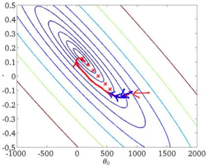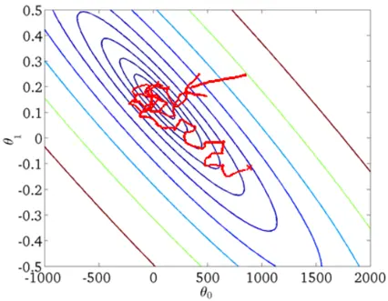 上图是每次迭代后的等高线图,每个不同颜色的线表示代价函数不同的值。运用梯度下降会快速收敛到圆心,即唯一的一个全局最小值。