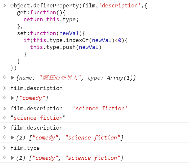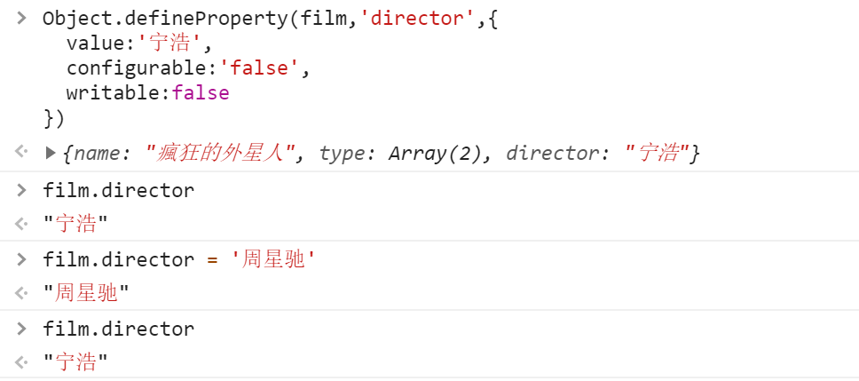 film 对象包含两个(数据)属性 name & type,数据属性可以这样直接定义,那如何定义一个访问器属性?需要借助 Object 对象的静态方法:defineProperty。