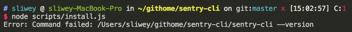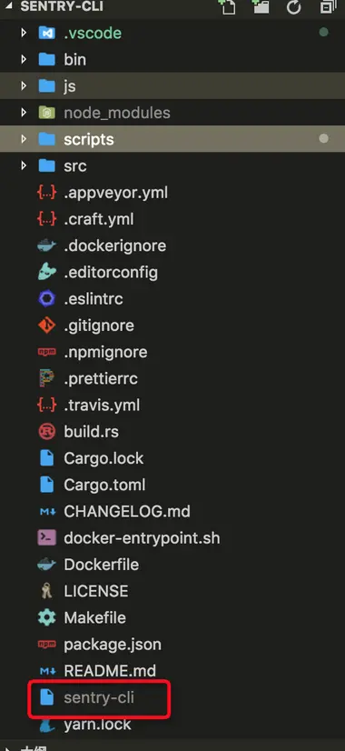 发现实际上是在执行 /Users/sliwey/githome/sentry-cli/sentry-cli --version 命令时发生的错误,根据上面的路径发现在项目根目录下多了一个叫 sentry-cli 的可执行文件。