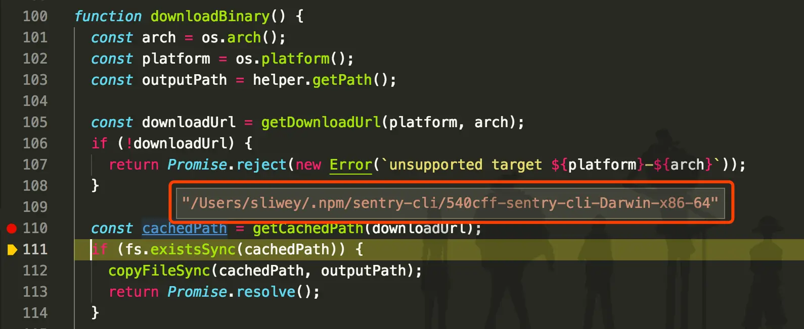 根据刚才本地的执行情况来看,并没有进行下载,可知那个可执行文件是从缓存中拿的,那就打个断点看一下缓存路径: