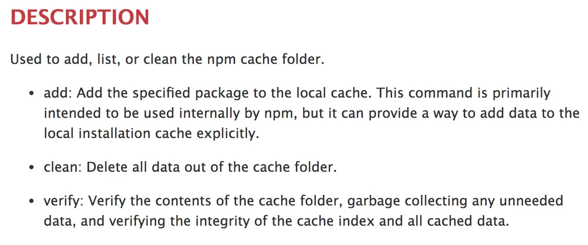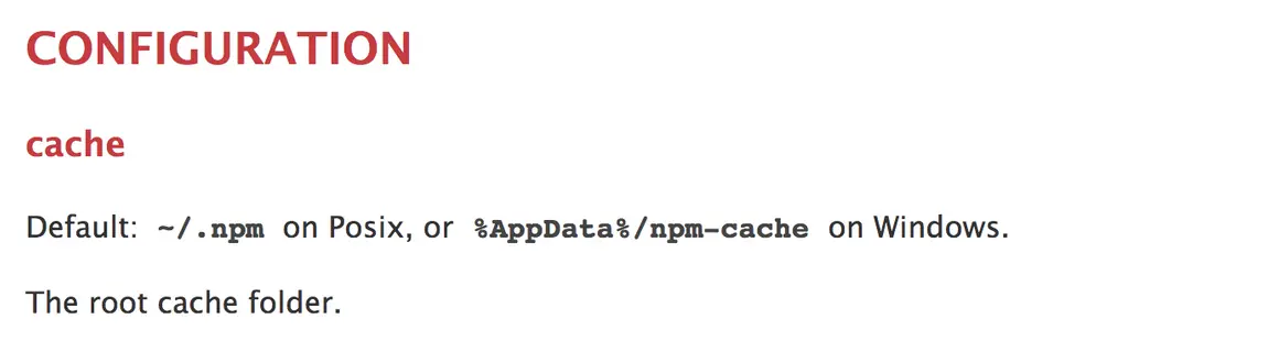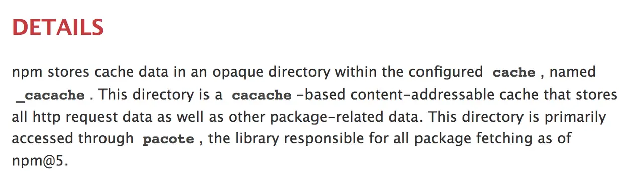根据上面得到的缓存路径,可以知道 sentry-cli 缓存在 ~/.npm 文件夹下,所以跟yarn应该没关系,先排除掉。然后来看npm,发现通过 npm cache clean --force 来清除缓存,并没有清掉 ~/.npm 文件夹下的文件,那么这个命令清的是哪里呢?先看下文档怎么说:npm-cache