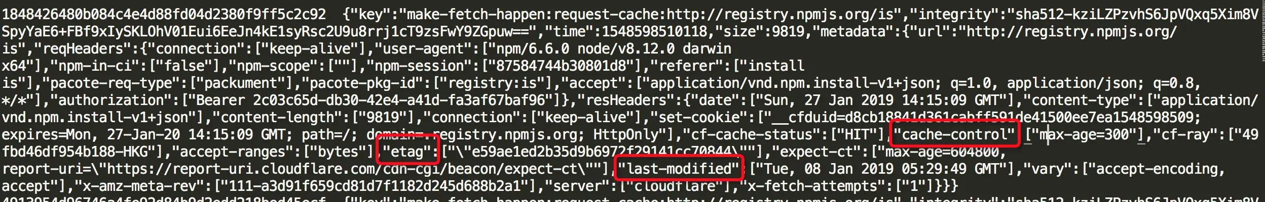 打开可以发现 content-v2 里面基本都是一些二进制文件,把二进制文件的扩展名改为 .tgz 再解压之后,会发现就是在我们熟知的npm包。 index-v5 里面是一些描述性的文件,也是 content-v2 里文件的索引,仔细看会发现有点像HTTP的响应头,而且还有缓存相关的值: