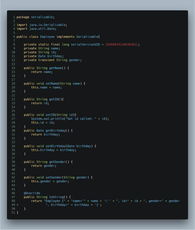 注意第12行代码,gender字段前面的关键字:transient。意思是告诉Java序列化框架,在序列化和反序列化时,不要考虑该gender字段。