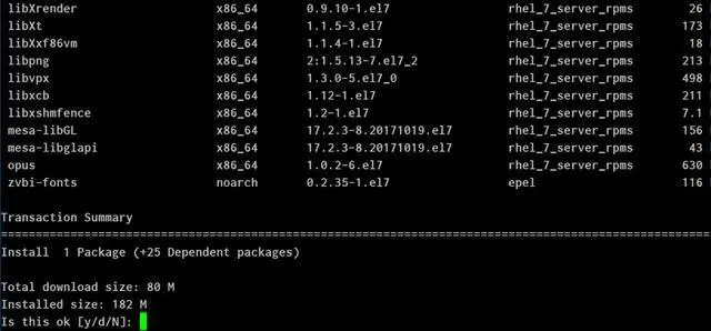依赖分析计算结果:有超过25个依赖包需要下载,总共需要下载80M,安装大小182M。选择Y继续: